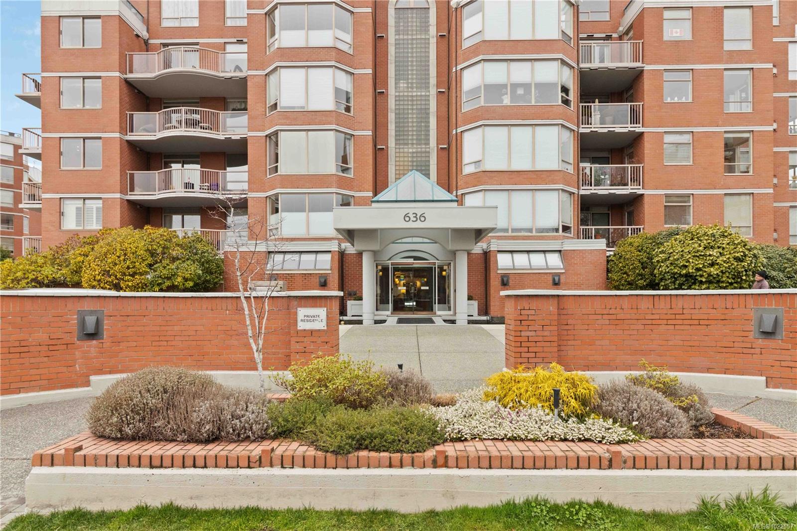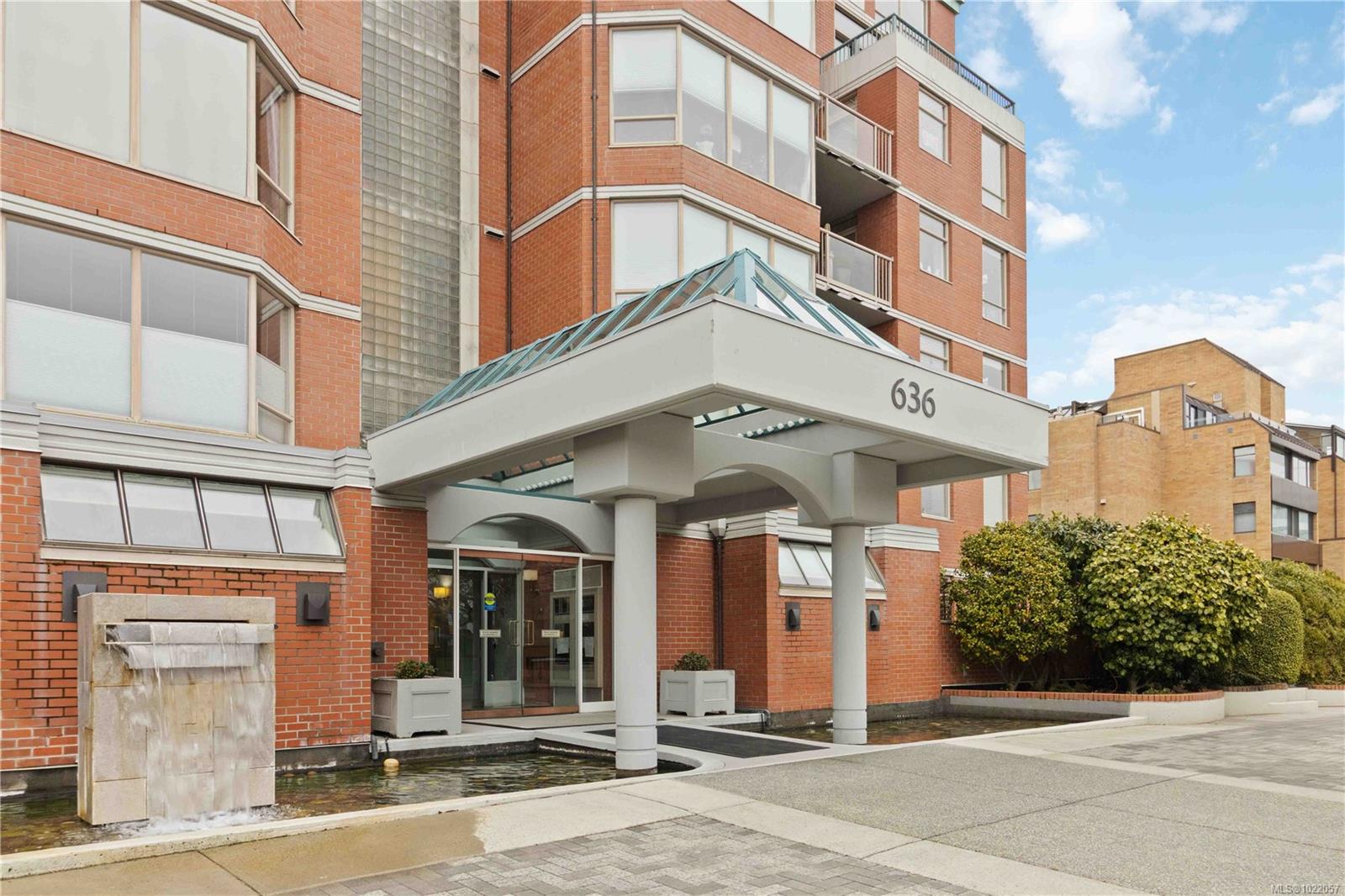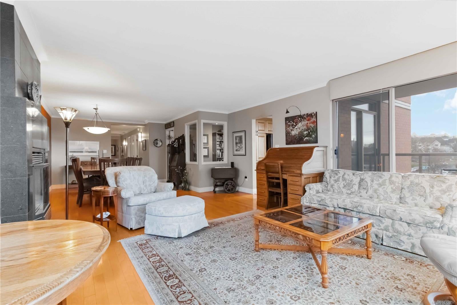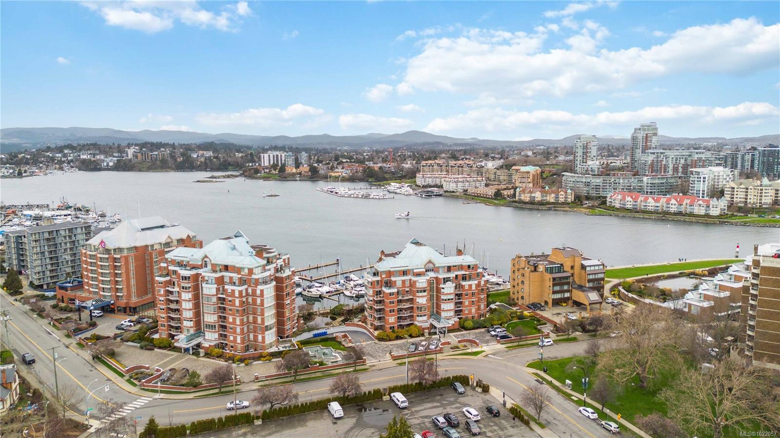 Enjoy gorgeous OCEAN views from this ideally located, spacious 2 BED & Den condo in Victoria's Harbourside. Perfectly positioned to witness spectacular sunsets & enjoy the action of the Inner Harbour, while appreciating the serenity & comfort this luxury building provides. Turn key, one level living with gleaming wood floors, a newer kitchen with quartz counters & maple cabinetry & updated bathrooms. The thoughtful floor plan includes a large dining area built to accommodate gatherings of any size, excellent separation between the primary bed & living area, a deck accessed from the kitchen & living area, separate laundry & lovely little touches throughout including; a seated vanity table in the ensuite, ample closet space & heated floors in the powder room. Underground parking & well appointed lobby & just a short stroll to all that makes the Garden City so desirable; Fisherman's Wharf, Ogden Point, The Empress and a plethora of shops & services.