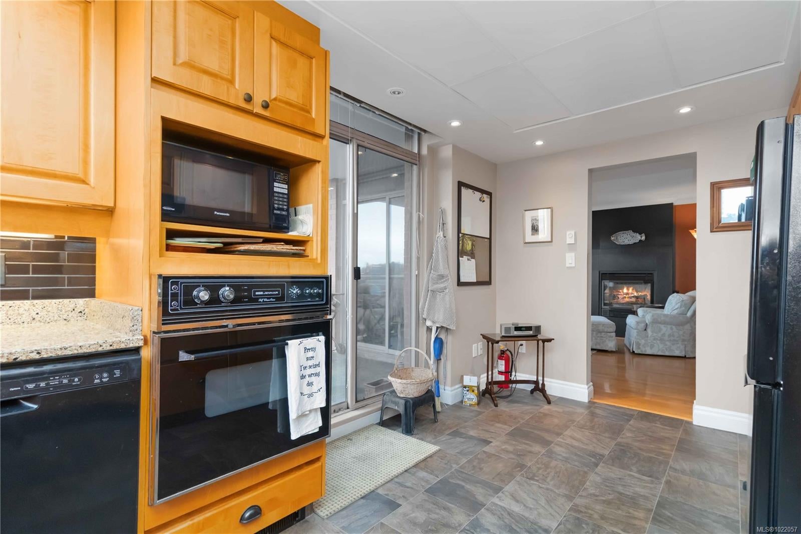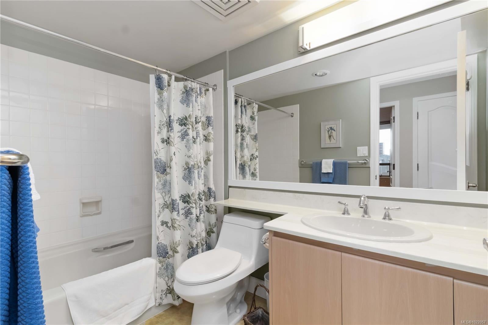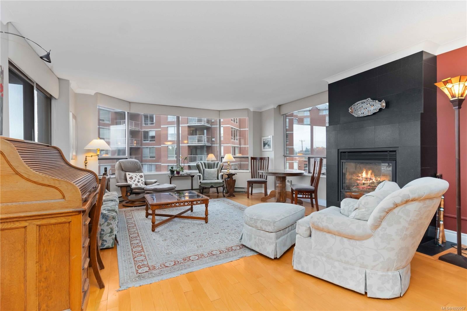 Enjoy gorgeous OCEAN views from this ideally located, spacious 2 BED & Den condo in Victoria's Harbourside. Perfectly positioned to witness spectacular sunsets & enjoy the action of the Inner Harbour, while appreciating the serenity & comfort this luxury building provides. Turn key, one level living with gleaming wood floors, a newer kitchen with quartz counters & maple cabinetry & updated bathrooms. The thoughtful floor plan includes a large dining area built to accommodate gatherings of any size, excellent separation between the primary bed & living area, a deck accessed from the kitchen & living area, separate laundry & lovely little touches throughout including; a seated vanity table in the ensuite, ample closet space & heated floors in the powder room. Underground parking & well appointed lobby & just a short stroll to all that makes the Garden City so desirable; Fisherman's Wharf, Ogden Point, The Empress and a plethora of shops & services.